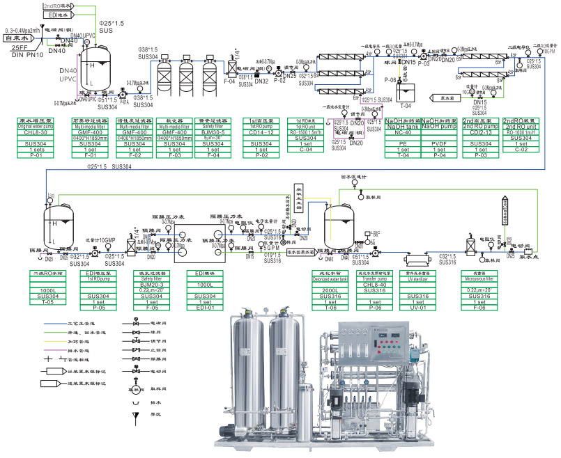 原水→原水箱→增壓泵→石英砂過(guò)濾器→活性炭過(guò)濾器→軟化器→保安過(guò)濾器→高壓泵1→反滲透裝置1→PH調(diào)節(jié)裝置→高壓泵2→反滲透裝置2→二級(jí)水箱→EDI泵→微孔過(guò)濾器→EDI模塊→紫外線消毒器 →純化水箱 →車(chē)間輸送泵→紫外線殺菌器→濾菌器→(臭氧消毒)→用水點(diǎn)→純化水箱